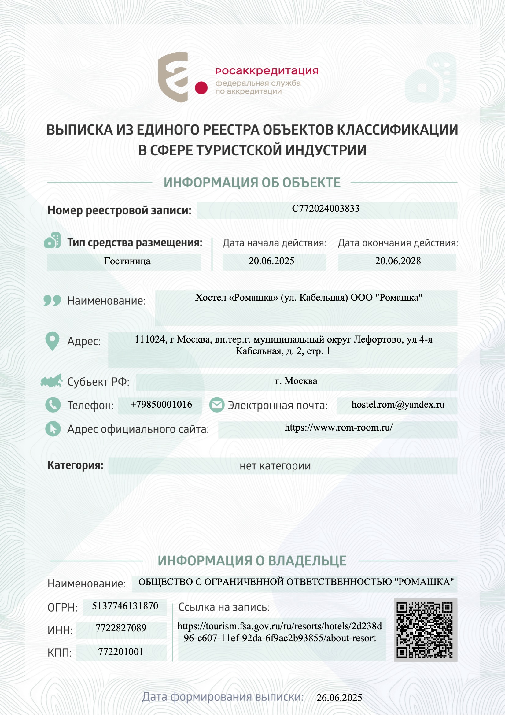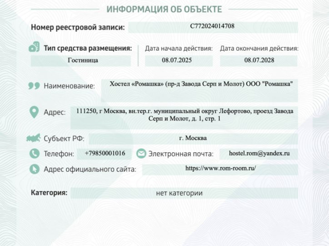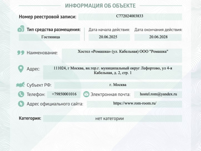 Хостелу «Ромашка» присвоена категория, как объекту туристкой деятельности!